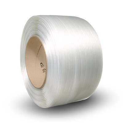 příčně pletená vázací PES páska šíře 16mm, návin 850m, tah 450Kp dutinka průměr 76mm, barva bílá 2 role v kartonu, váha kartonu 15,2kg 40 kartonů na paletě vhodný napínač H21, spony BG5, BF5